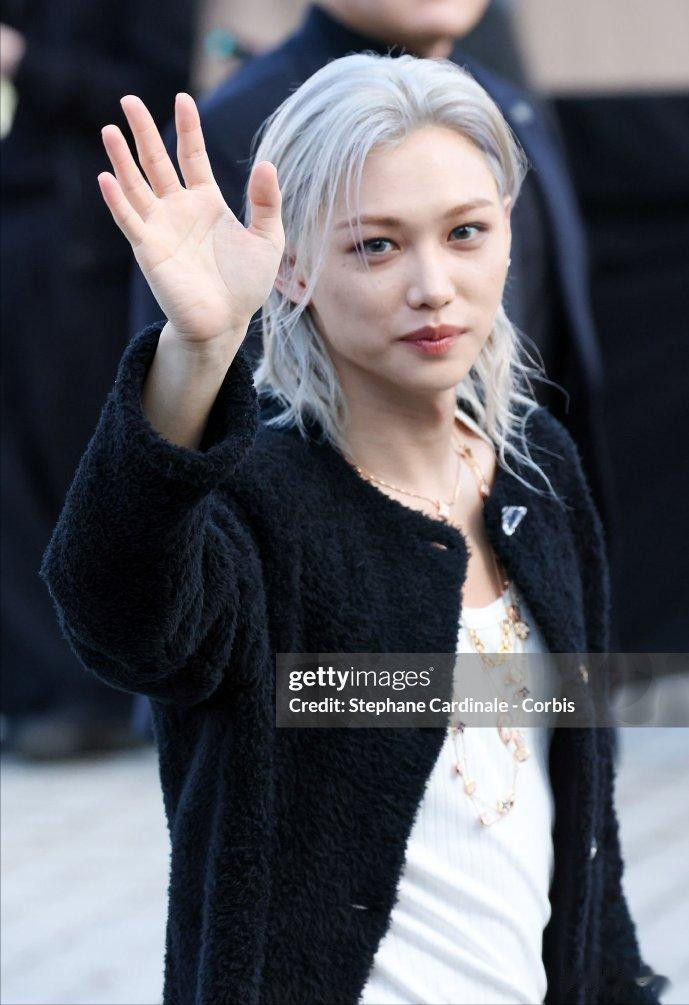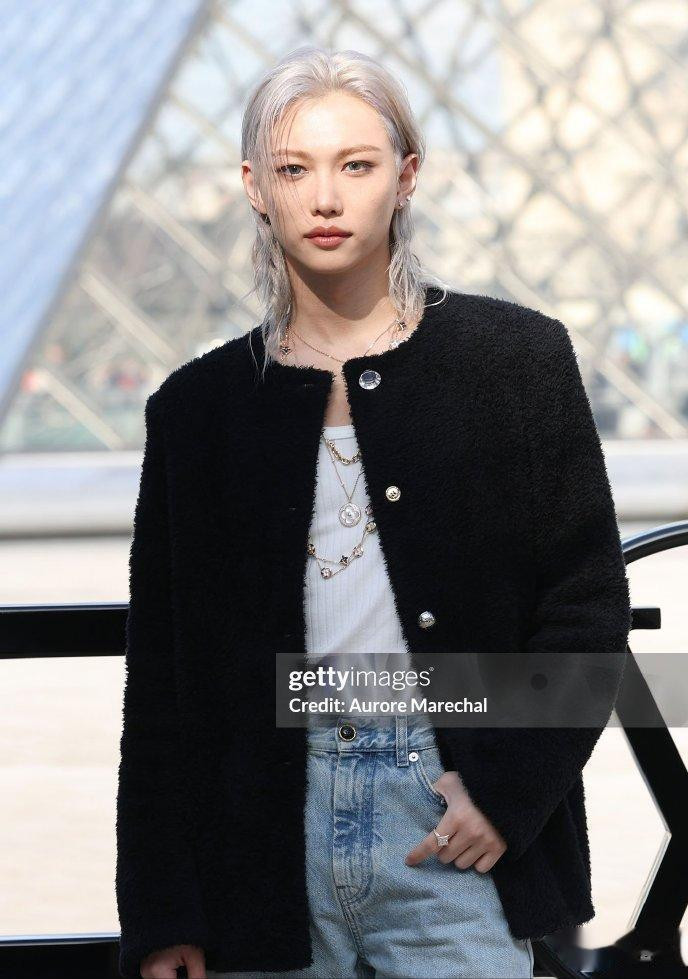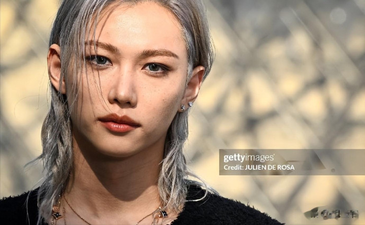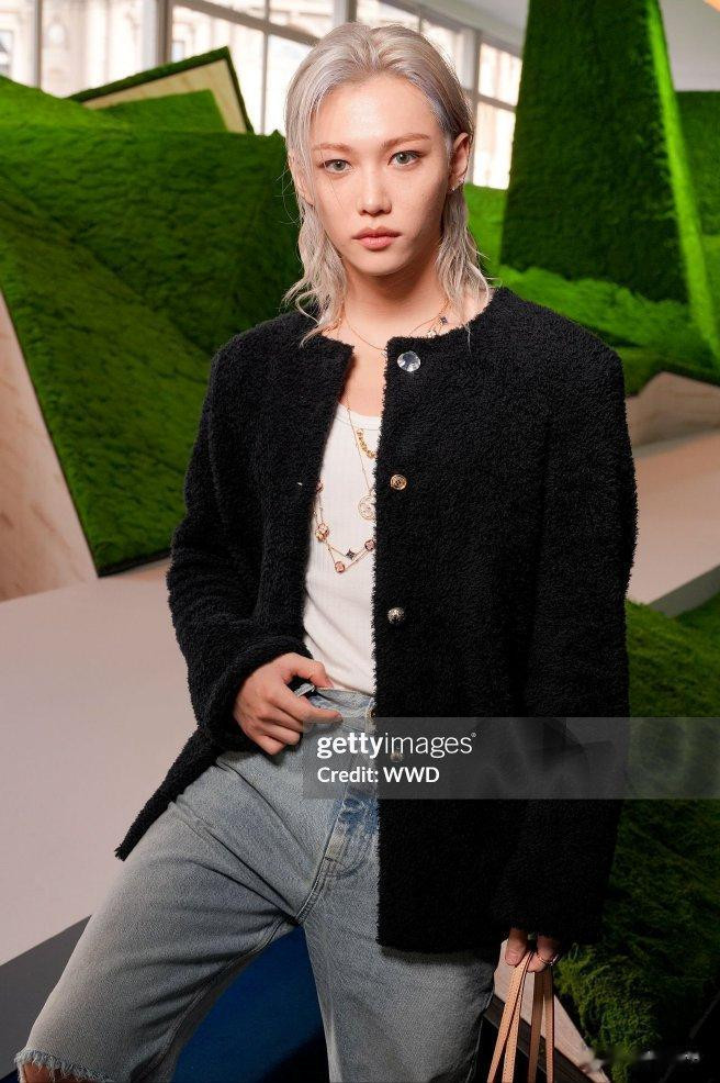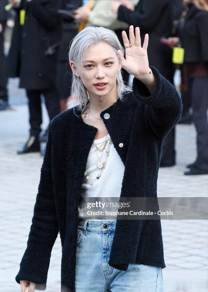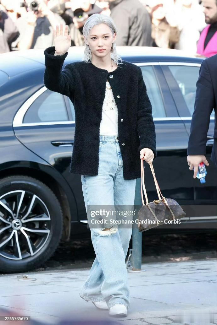 李龙馥一头银灰色的狼尾发型搭配黑色粗花呢外套,下身搭了条简约牛仔裤。