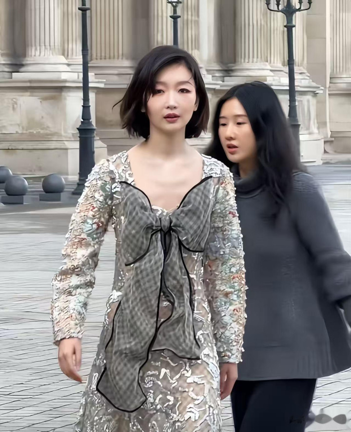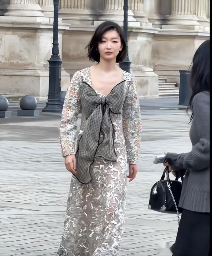 但腰部以下的亮片堆积,在视觉上让重心下移,直接把她的身高压矮了。